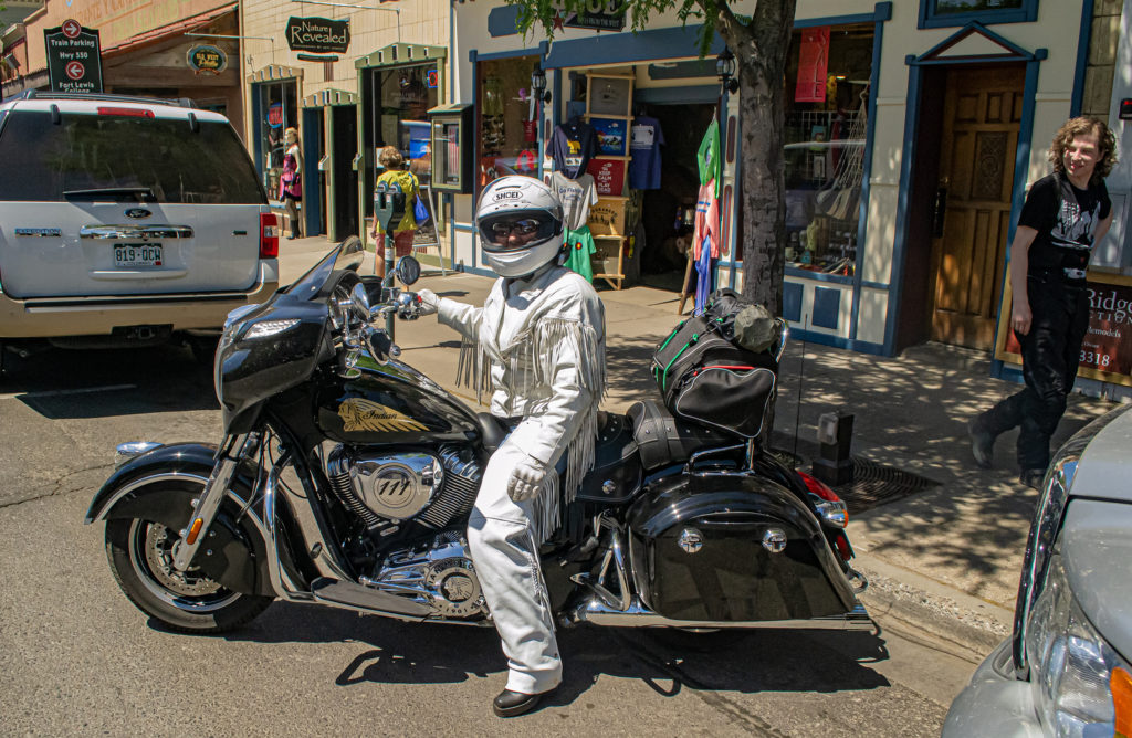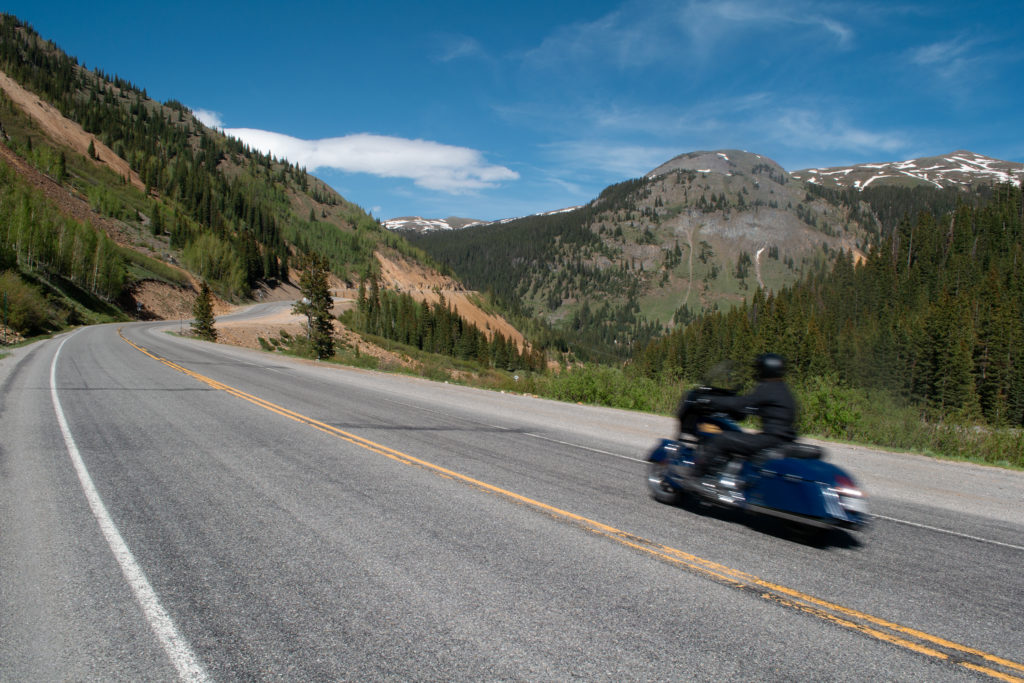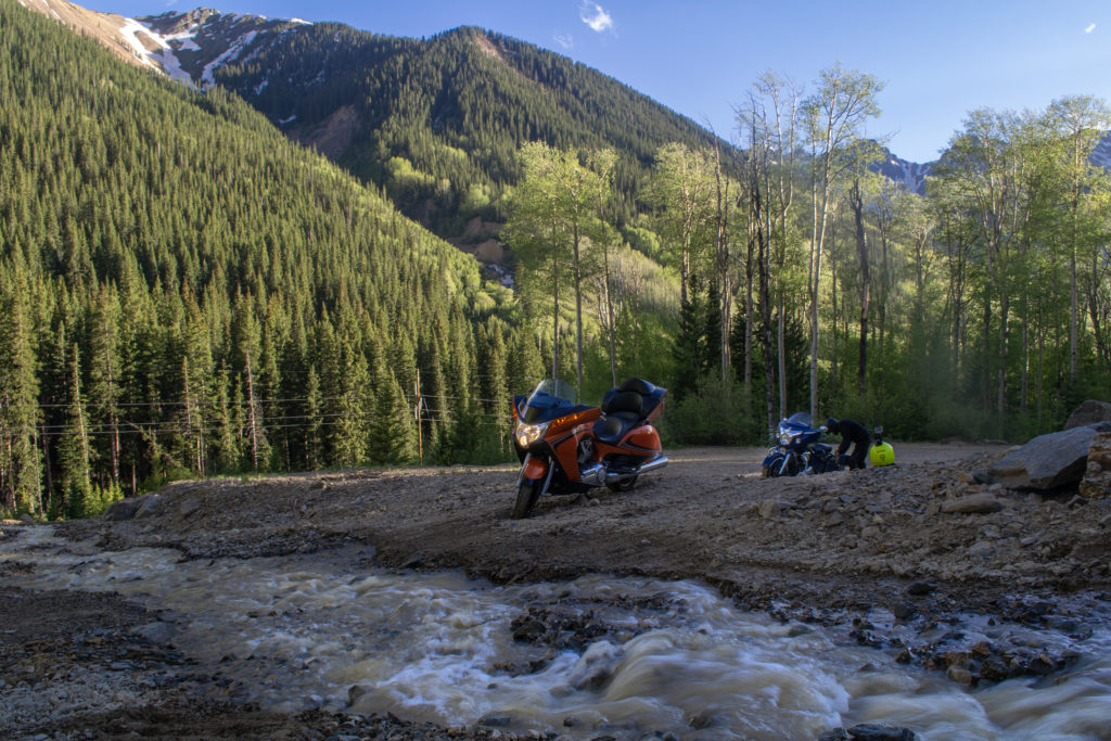 Nästa dag tar vi den fullkomligt suveräna highway 141 söderut i riktning mot Durango. De röda sandstensbergen som kantar 141:an övergår efter några mil i ett storslaget, flackt och grönt landskap som hade kunnat vara östgötaslätten om det inte vore för de spetsiga och snöklädda bergstopparna i horisonten. När vi närmar oss San Juan National Forest börjar det mörkna och jag tycker det verkar vara en bra idé att ta en genväg. Simon är inte lika övertygad och bilister som med oroade anletsdrag frågar ”Are you okey?” när vi har stannat för att ta några bilder verkar inte göra honom mer hågad. Men med tillräckligt trovärdiga förespeglingar om tidigare ankomst får jag honom med mig in på en lättkörd grusväg med beteckningen ”630”. Den ser ut som en utmärkt genväg till Millon Dollar Highway på andra sidan fyrtusen meter höga Lookout Peak. Vi passerar bosättningen Ophir med 113 invånare, kör in i skogen på en mindre grusväg och stannar där forsande smältvatten plötsligt har skapt en djup fåra över vägen. Inre bilder av två fyrahundra-kilosmotorcyklar liggande på sina sidor i det strömmande vattnet får oss att mödosamt vända och köra tillbaks till 145:an.
