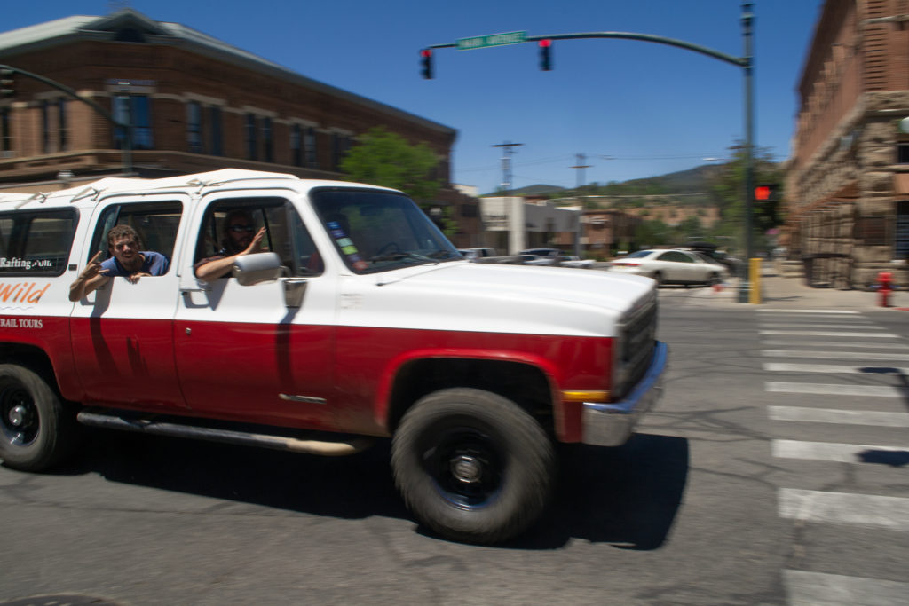 Glenwood Springs är en gammal kurort belägen i en trång ravin där järnväg, Interstate 70 och Coloradofloden trängs om utrymmet. Vi har reserverat rum på Glenwood Hot Springs med anor från 1888. En lätt hysteriskt trevlig bellboy informerar oss om hotellets anor och förser oss med medlemskort som ger tillträde till morgondagens frukostbuffé. Den serveras vid poolen, som är världens största med konstant 37-gradigt vatten från varma källor. Tretton miljoner liter vatten omsätts varje dygn, får vi veta. Resan över Klippiga bergen har varit solig men förrädiskt sval och som en aningslös förstagångsresenär till Medelhavet har jag kört hela sträckan i t-shirt. Mina ilsket rödbrända armar blir en lärdom för resten av resan: 50+ solskyddsfaktor på alla kroppsdelar som är exponerade för dagsljus.