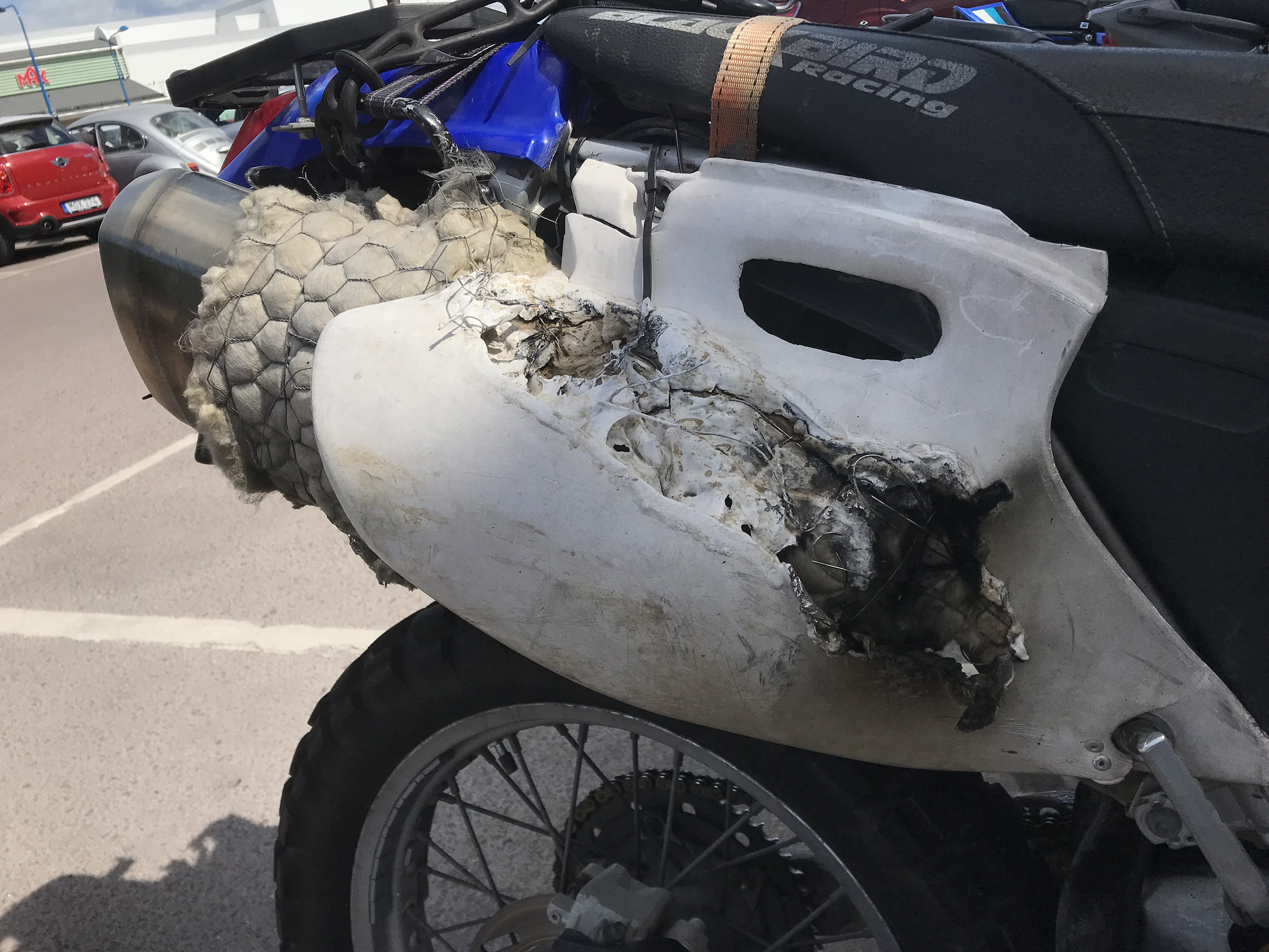 Somliga ljuddämpare blir mer heta än andra och här ser vi en monterad på en Yamaha TT 600 R med tydlig hemvist i den ena kategorin. Eller rör det sig framför allt om bruk av eftermarknadsdelar av låg kvalitet?