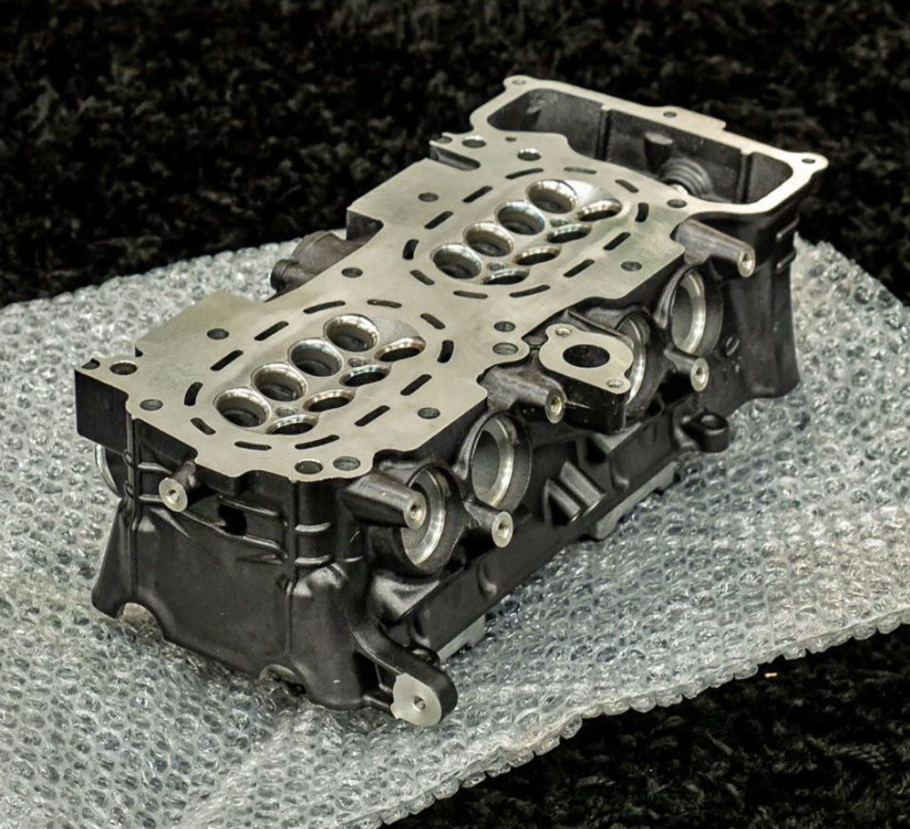 Motorn i endurance-racern med sitt 8-4-2-1-avgasysstem. 170 hästkrafter vid 16 500 varv var långt mer än samtida 1000-kubikare. 85° vinkel mellan de två cylinderparen.