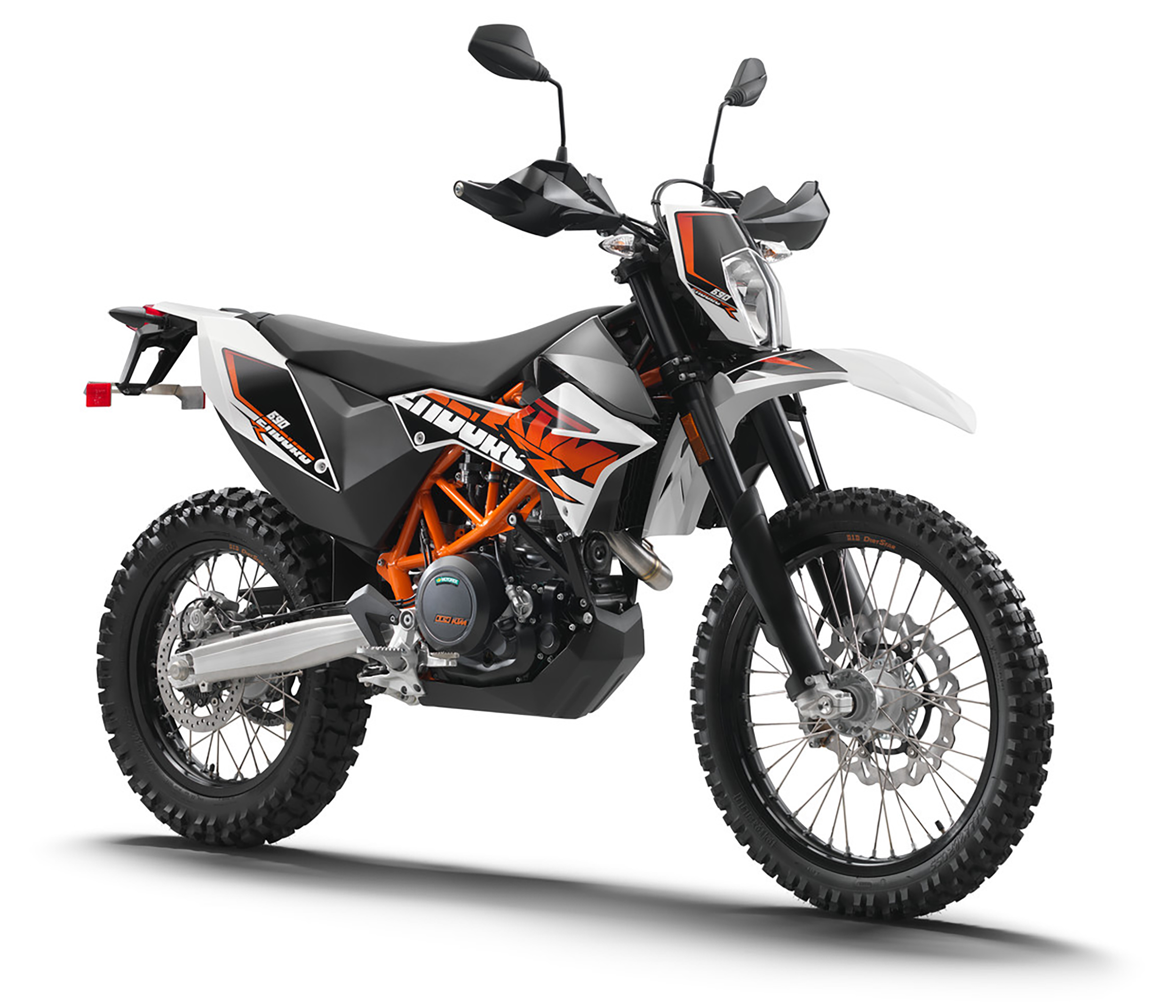 Bromsarna håller mycket hög kvalitet; en stor 300-millimetersskiva fram greppas av fyrkolvsok från Brembo. Från årsmodell 2014 är ABS (avstängbar) originalmonterat. Till årsmodell 2012 fick Enduro 690 R större borrning, från 80 till 84 millimeter, vilket ökade slagvolymen från 654 till fulla 690 kubik. Sätet fick samtidigt ny form och blev lite bredare, vilket förbättrade komforten en del.