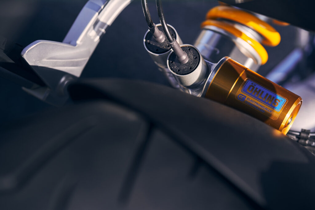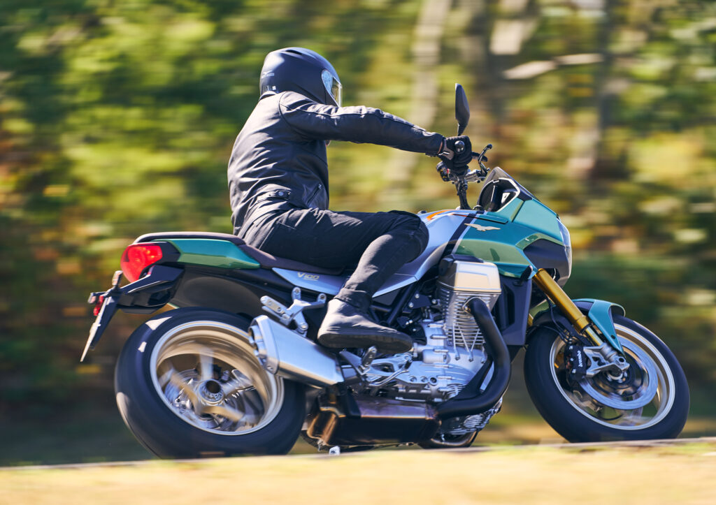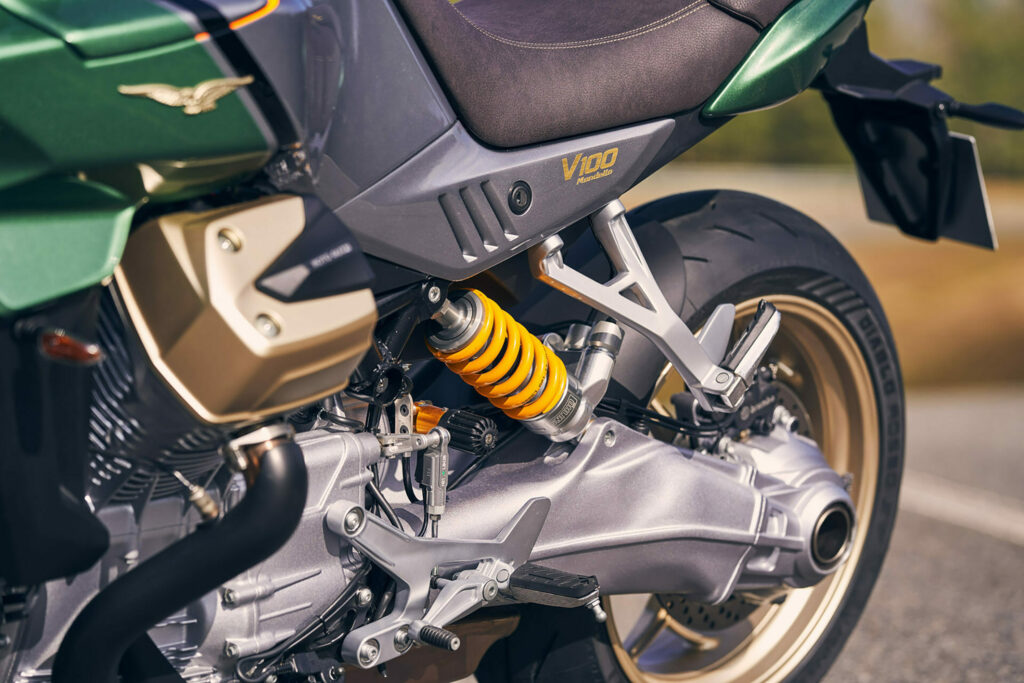 Med prefixet S ingår finfjädring som justeras med knappar på vänster styrhalva i standardutrustningen.Notera att den som ibland tänker demontera bakhjulet på egen hand kommer behöva en ganska speciell hylsa för centrummuttern.En färgsättning som Moto Guzzi helt enkelt kallar grön (verde). Den mer diskreta grå-svarta kallas grigio avanguardia.Vi konstaterar att man åstadkommer minst lika hög detaljfinish i Mandello del Lario som på andra håll i Italien.