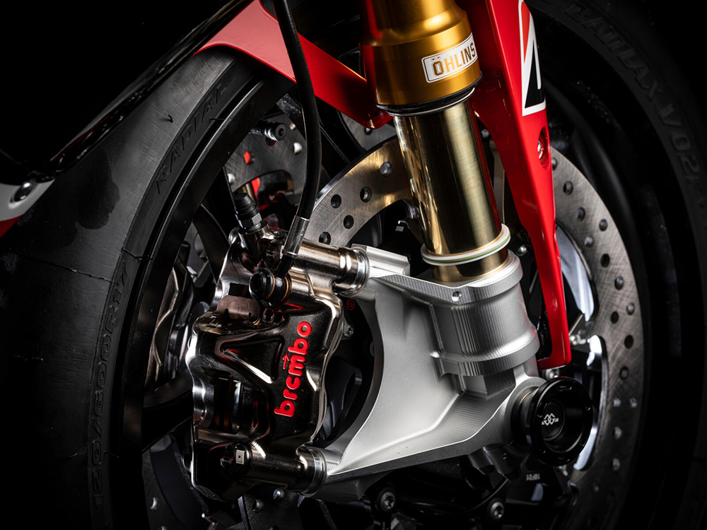 Specialtillverkat fäste för Brembo-oket med tydliga spår efter CNC-svarv.